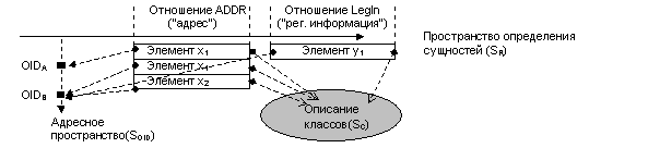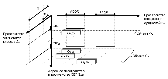 В каждый объект класса "Юридическое лицо" будет входит три набора данных, три поля, каждое из которых содержит определенную информацию об этом объекте: 1) фактический адрес 2) регистационная информация 3) юридический адрес. Каждый из этих наборов данных содержит информацию о их состоянии в процессе определенного взаимодействия с другими объектами окружающего мира, информацию определяющую возможность этого взаимодействия. Говоря по другому, каждый из этих наборов данных содержит информацию об одной из многих сущностей этого объекта. Рассмотрим поля содержащие юридический и фактический адреса. В принципе, почтовая корреспонденция может быть послана по любому из этих адресов. Структура этих полей абсолютно одинакова. Эта структура определяется их собственным смыслом (т.е. их смыслом вне объекта, атрибутами которого являются эти поля), определяется их сущностью, которая может быть выражена словом "адрес". Информация содержащаяся в таких полях является достаточной для установления определенной связи (например почтовой) с содержащими их объектами. Чтобы послать письмо важно наличие у объекта-получателя поля с сущностью "адрес", а какой объект - человек или фирма - данным адресом идентифицируется, какой текст находится в письме, что представляет данный адрес в контексте объекта - вся эта информация совершенно неважна для того чтобы письмо было послано по почте объекту, которому этот адрес принадлежит. Разница между этими полями (в одном случае адрес является юридическим, в другом - фактическим) существует только если рассматривать их в контексте объекта. Именно класс определяет по какому из этих адресов письмо должно быть послано. Обратим особое внимание на то, что вне контекста класса все информационное содержимое полей, имеющих сущность "адрес", определяется только содержащимися в них данными. Только эти данные являются существенными.[11] Из этого следует, что в сущности адрес имеет реляционную природу и может рассматриваться как схема соответсвующего отношения. Тоже можно сказать и про сущность "регистрационная информация". Рассмотрим наш пример более формально. Существует класс A описывающий клиентов, которым надо рассылать корреспонденцию.. Этот класс включает поле X1 содержащее фактический адрес клиента; это поле является котрежом отношения ADDR соответствующего сущности "адрес". Существует производный класс В (фирма) включающий поле X2 (юридический адрес) являющееся кортежом того же отношения ADDR и поле Y1 являющегося кортежом другого отношения LegIn соответствующего сущности "регистрационная информация". Создадим объект ОА класса А идентифицируемый OID1 и объект ОВ класса В идентифицируемый OID2. В нашем примере мы имеем дело и с классами (объектная модель) и с отношениями (реляционная модель). Поскольку объектная и реляционная модели могут рассмариваться только как ортогональные, этот пример может быть проиллюстрирован следующим образом (рис. 4) R*O-система
