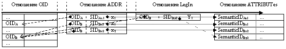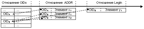 вводит в класс Client поле postaddress описывающее запись созданной ранее таблицы ADDR. Для каждого объекта данного класса существующего в системе, в таблице ADDR будет существовать запись, принадлежащая этому объекту, и имеющая семантическое значение postaddress. Такую запись можно назвать полем табличного типа или табличным атрибутом объекта. (Надо заметить, что объект может содержать кортежи любых, в том числе и производных отношений). Подобный подход может представлять интерес, поскольку подразумевает неизменность исходных языковых конструкций и, вместе с тем, придает им новые возможности. В принципе, можно использовать языковые конструкции любых О- и R- языков. Отметим, что в данном случае SQL не является встроенным языком и, соответственно, О-язык не является базовым языком. Скорее О-язык можно рассматривать как расширение DDL SQL позволяющее объединить отдельные записи в виде сложных объектов. Сущность "ОID".Представим адресное пространство R*O-системы в виде отношения OIDs имеющего поле OID в качестве первичного ключа. Ранее отмечалось, что информация о OID является существенной для любого кортежа RxO системы. Поэтому любое отношение, содержащее информацию об объектах, должно иметь поле OID, которое должно быть объявлено как внешний ключ, ссылающийся на поле OID отношения OIDs. Данная связь определяет, атрибутами каких именно объектов являются определенные кортежи этих отношений . После этого проекцию SR-SA можно будет представить в следующем виде (рис.7)