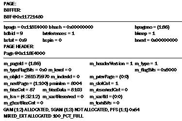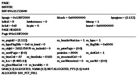 РИСУНОК 3. Заметьте, что идентификатор объекта (m_objId) в заголовке страницы соответствует результату выполнения оператора SELECT OBJECT_ID ('TAl'), и страница принадлежит таблице ТA1. Тип экстента смешанный, страница заполнена на 100%. Аналогичным образом можно прочитать заголовок индексной карты размещения. DBCC TRACEON (3604) DBCC page ('MYDB', 1,87,0,0) Результат представлен на Рисунке 4.