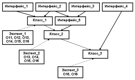 Определение класса отличается от определения интерфейса наличием двух необязательных разделов: extends и списка дополнительных свойств. В действительности, наиболее важным отличием класса от интерфейса является возможность наличия второго из этих разделов. В списке свойств могут присутствовать элементы extent и key. В спецификации модели данных ODMG 3.0 говорится, что для каждого класса может быть определен только один экстент, являющийся объектом-множеством всех объектов этого класса, которые после создания должны сохраняться в базе данных. Другими словами, включение в определение UDT элемента extent приводит (а) к неявному определению объектного типа множества, элементами которого являются объекты (на самом деле, OID объектов) определяемого UDT; (б) к неявному созданию объекта этого типа множества, причем к этому объекту возможен доступ по имени UDT; (в) автоматическому обновлению состояния экстента при каждом создании/уничтожении объекта UDT. Заметим, что, во-первых, у UDT может отсутствовать экстент, и, во-вторых, объект (его OID) может входить в несколько объектных коллекций, любую из которых, наряду с экстентом UDT, можно использовать в OQL-запросах. Если объект можно трактовать как аналог стабильно хранимой переменной, а OID – как указатель на эту переменную, то объект-коллекцию можно воспринимать как контейнер коллекций OID объектов одного UDT, т.е. как контейнер коллекций указателей на переменные. Ключ – это набор свойств объектного класса, однозначно идентифицирующий состояние каждого объекта, который входит в экстент класса (это аналог возможного ключа реляционной модели данных). Для класса может быть объявлено несколько ключей, а может не быть объявлено ни одного ключа даже при наличии определения экстента. В последнем случае в экстенте класса могут существовать разные объекты с одним и тем же состоянием.15 Далее, хотя и интерфейсы, и классы являются средствами определения объектных типов, между ними проводится жесткое различие. Допускается создание объектов только тех объектных типов, которые определены как классы. Объектные типы, определенные как интерфейсы, могут использоваться только для порождения новых объектных типов (интерфейсов и классов) на основании множественного наследования. Классы могут определяться на основе множественного наследования интерфейсов и одиночного наследования классов. Механизм наследования от интерфейсов называется в ODMG наследованием IS-A, а механизм наследования от классов – extends. Прежде чем попытаться пояснить этот подход, приведем пример графа наследования интерфейсов и классов, в котором также показывается место существующих экстентов и объектов (рис. 2). На рис. 2 "жирными" стрелками показаны связи объектных типов по наследованию IS-A. Обычные стрелки показывают связи по наследованию extends. Пунктирные стрелки соответствуют связям экстентов и соответствующих классов. Обратите внимание, что на этом рисунке у каждого из классов, входящих в иерархию, определен свой собственный экстент. Как демонстрирует рисунок, в модели ODMG поддерживается семантика включения, означающая, что экстент любого подкласса является подмножеством экстента любого своего суперкласса (прямого или косвенного). Кроме того, независимо от наличия или отсутствия поддержки экстентов, работает полиморфизм по включению: любой объект л