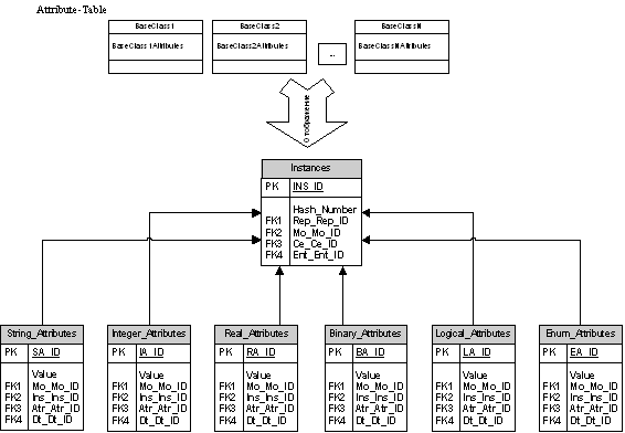 Рис. 11. Организация реляционных таблиц для представления атрибутов простых типов в паттерне Attribute–Table