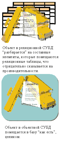 При чтении объекта из реляционной базы он собирается из отдельных элементов и только затем пригоден для использования -. В объектных СУБД все иначе. Данные объекта, а также его методы помещаются в хранилище как единое целое. Таким образом, объектные языки получили средство долговременного хранения данных.