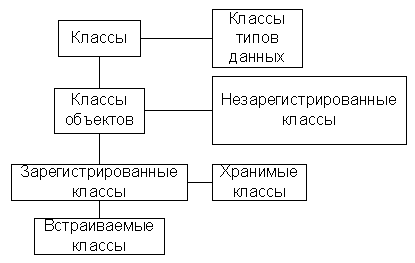 Рис.2. Объектная модель Cache' Различают два подтипа классов объектов - зарегистрированные и незарегистрированные. Зарегистрированные классы обладают предопределенным поведением, т.е. набором методов, наследуемых из системного класса %RegisteredObject и отвечающих за создание новых объектов и за управление размещением объектов в памяти. Незарегистрированные классы не обладают предопределенным поведением, разработка функций (методов) класса целиком и полностью возлагается на разработчика. Зарегистрированные классы могут быть двух типов - встраиваемые и хранимые. Встраиваемые классы наследуют свое поведение от системного класса %SerialObject. Основной особенностью хранения встраиваемого класса является то, что объекты встраиваемых классов существуют в памяти как независимые экземпляры, однако могут быть сохранены в базе данных, только будучи встроены в другой класс. Основным преимуществом использования встроенных классов является минимум издержек, связанных с возможным в будущем изменением набора одинаковых свойств классов, представленных в виде встраиваемого объекта. Хранимые классы наследуют свое поведение от системного класса %Persistent. %Persistent предоставляет обширный набор функций своим наследникам, включающий: создание объекта, подкачку объекта из БД в память, удаление объекта и т.п. Каждый экземпляр хранимого класса имеет 2 уникальных идентификатора - OID и OREF. OID (object ID) характеризует объект, записанный в БД, т.е. на физическом носителе, а OREF (object reference) характеризует объект, который был подкачен из БД и находится в памяти. Объектная модель Cache' в полном объеме поддерживает все основные концепции объектной технологии: