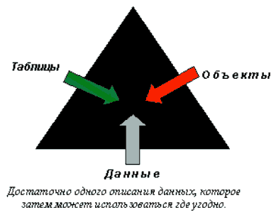 СУБД Cache' является уникальной системой. Наряду с реализацией в полном объеме основных принципов объектной технологии в СУБД Cache' поддерживается также структурированный язык запросов SQL для обеспечения выполнения запросов по стандарту, поддерживаемому многими инструментальными средствами. Кроме этого, с помощью единой архитектуры данных Cache' возможно автоматическое преобразование реляционных таблиц в классы объектов. При этом, при поступлении на сервер Cache' SQL DDL-описания реляционной таблицы Cache' автоматически преобразует DDL-описание во внутреннюю структуру хранения данных и сохраняет полученную структуру в словаре данных. Затем с помощью поставляемых в стандартной комплектации Java- или ODBC- драйверов производится импорт данных из реляционных таблиц в многомерные структуры ядра Cache'. После чего Cache' предоставляет возможность работы с данными, как в виде реляционных таблиц, так и в виде классов объектов. Таким образом, при переходе с реляционной технологии на объектную технологию разработка не начинается с "нуля" - многое уже сделано Cache' автоматически. Классы Cache' также могут быть представлены в виде реляционных таблиц, причем соотношение между разнообразными понятиями объектного и реляционного подходов представлены ниже: