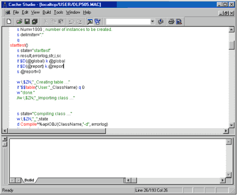 Рис.4. Cache' Studio. С помощью утилиты Cache' Studio можно создавать Cache'-программы. Внешний вид утилиты приведен на рис.4. Для удобства пользователя в Cache' Studio реализована контекстная подцветка команд, функций и операторов COS.