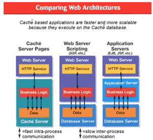 Рис.7. Сравнение web-технологий. Серверные страницы Cache' представляют собой текстовые HTML-файлы, расширяемые тегами приложений Cache' (Cache' Application Tags или CATs). Для создания CSP приложений можно воспользоваться стандартными средствами разработки HTML страниц (Cache' предоставляет add-in модуль для полной интеграции с Macromedia DreamWeaver) или, на крайний случай, обыкновенным текстовым редактором. В Листинге 1 приведен пример небольшого CSP-приложения, которое выводит значения свойств объекта, хранящегося в БД Cache'. Листинг 1.