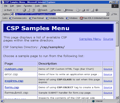 При открытии CSP-страницы в браузере Cache' автоматически преобразует CSP-страницу в класс Cache' (по умолчанию классом-предком для CSP-классов является системный класс %CSP.Page). CSP-класс - это не просто способ представления кода. Это отражение полноценной объектной модели CSP-приложения. Т.е. можно использовать все преимущества объектного подхода к разработке при работе с CSP, такие как наследование и полиморфизм. После преобразования CSP-страницы в класс Cache' класс можно редактировать, используя возможности Object Architect, например, возможность контекстной подцветки кода методов. Для изучения CSP можно воспользоваться примерами, поставляемыми в стандартной комплектации Cache'. Для этого необходимо установить Cache' и в браузере обратиться по адресу http://127.0.0.1:1972/csp/samples/menu.csp: