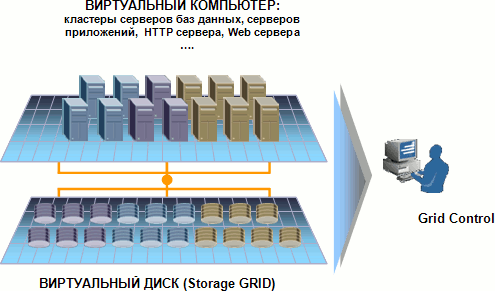 Рассмотрим эти тенденции подробнее. 1. Виртуализация ресурсов и GRID-технологииВ настоящее время в большинстве организаций для каждого приложения выделяется свой компьютер (группа компьютеров) и свой набор дисков для хранения БД. Как правило, эти компьютеры и диски различными приложениями совместно не используются. Поскольку в реальной жизни нагрузка на приложения постоянно изменяется, мы часто имеем ситуацию, когда одни компьютеры сильно перегружены, в то время как другие недогружены или простаивают. В одних системах есть запас дисков, а в других дискового пространства катастрофически не хватает. Однако, к сожалению, мы не можем оперативно перебрасывать дисковые и процессорные ресурсы туда, куда надо. Например, если в течение квартала идет большой поток транзакций, а в конце квартала он спадает, но начинает возрастать нагрузка на систему создания корпоративной отчетности, то мы вынуждены на обе системы держать максимальные вычислительные мощности. Система получается дорогой, избыточной, негибкой. Выходом является виртуализация ресурсов. При этом все диски центра обработки данных (ЦОД) объединяются в один большой виртуальный диск, на котором располагаются все данные всех приложений, и мы можем гибко на ходу увеличивать этот виртуальный диск, добавляя к нему новые физические диски, или легко отдавать место для хранения тем приложениям, которым оно сейчас необходимо. Та же картина и с процессорным ресурсом. Объединение множества компьютеров в один виртуальный компьютер, на котором одновременно работает множество приложений, мощность которого можно легко увеличивать, на лету добавляя новые компьютеры, и возможность перераспределения вычислительных ресурсов этого суперкомпьютера между приложениями по мере необходимости позволяют резко повысить гибкость вычислительной системы, снизить ее стоимость и увеличить эффективность использования оборудования. Примером такой виртуализации является Oracle GRID [10], где диски объединены в Storage Grid, а компьютеры в Database Grid – виртуальный сервер БД и Application Grid – виртуальный сервер приложений. Для управления таким множеством элементов используется ПО Grid Control, которое позволяет работать с множеством объектов как с единым целым (рис. 1). Если в качестве элементов GRID используются дешевые элементы (дешевые диски, обычные Intel компьютеры), то стоимость такой вычислительной среды намного меньше, чем при использовании традиционных архитектур. Поскольку элементы виртуального диска или виртуального компьютера взаимозаменяемы, то система также обладает повышенной надежностью и живучестью, т.к. выход из строя одного или нескольких элементов не приводит к остановке работы. Система просто сама автоматически переконфигурируется и продолжает работу. Такой подход очень привлекателен для организаций, он позволяет создавать вычислительный ресурс неограниченной мощности и не заботиться о том, на каких компьютерах реально работает ваше приложение. Главное – запросить и получить тот вычислительный ресурс, который вам сейчас нужен. Система сама выполнит балансировку нагрузки для вашего приложения, создаст, если надо, БД с учетом обеспечения зеркалирования данных и снижения нагрузки по вводу/выводу, задействует столько элементов GRID, сколько необходимо для обеспечения требуемой вам надежности и пр