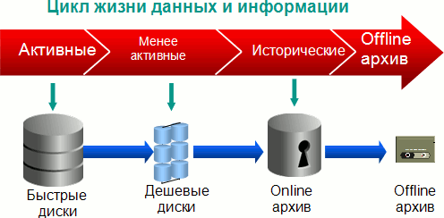 Рис 1. Oracle GRID 2 2. Встраивание Information Life Cycle Management (ILM) в СУБДКак известно, данные и информация имеют свой цикл жизни (рис. 2). Вначале они поступают в систему (в БД) и являются активными, т.е. используются очень часто. Нужно обеспечить быстрый доступ к информации и хранить ее на быстрых дорогих дисках. Затем информация начинает устаревать, переходит в разряд менее активной. Она все еще должна быть под рукой, но ее уже можно переместить на более дешевые и медленные диски.