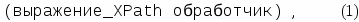 где выражение_XPath служит для выбора в обрабатываемом XML-документе набора узлов, подлежащих модификации, а обработчик специфицирует воздействие конкретной операции модификации на каждый из выбранных узлов. Обработчик может рассматриваться, как функция, которая получает на вход узел, подлежащий модификации, и возвращает результат воздействия конкретной операции модификации на данный узел. Предложенное представление операции модификации в виде пары значений получает естественную реализацию в терминах языка функционального программирования Scheme, поскольку в Scheme функции обладают свойством объектов первого класса. Функции как объекты первого класса могут, в частности, передаваться в качестве аргументов другим функциям, что позволяет нам рассматривать обработчик как черный ящик и, таким образом, абстрагироваться от внутренней реализации конкретного обработчика в дизайне языка модификаций. Рассматривая операцию модификации XML-данных в контексте языка функционального программирования Scheme и формата SXML, определим обработчик как функцию, имеющую следующую сигнатуру: