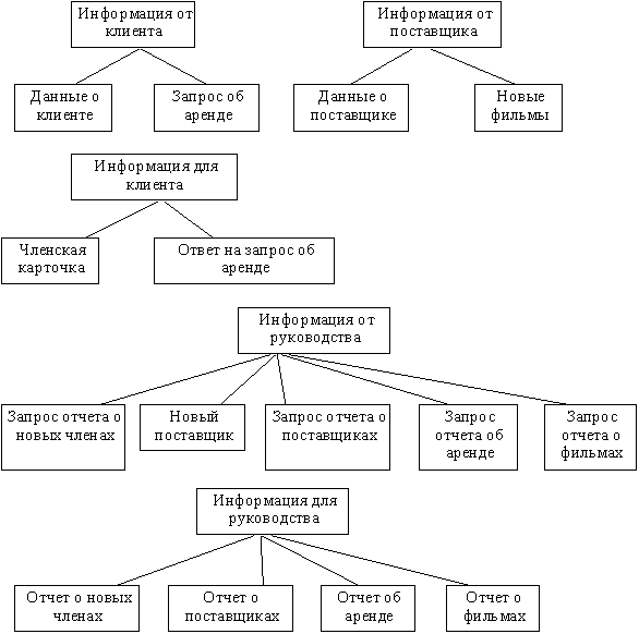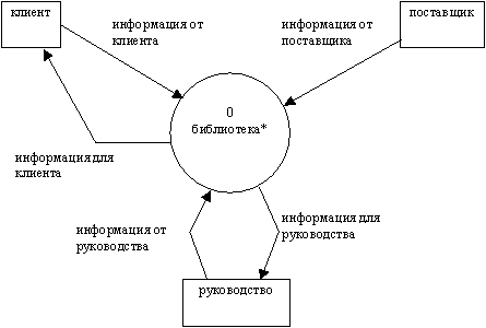 Назначение ИС определяет соглашение между проектировщиками и заказчиками относительно назначения будущей ИС, общее описание ИС для самих проектировщиков и границы ИС. Назначение фиксируется как текстовый комментарий в "нулевом" процессе контекстной диаграммы. Например, в данном случае назначение ИС формулируется следующим образом: ведение базы данных о членах библиотеки, фильмах, аренде и поставщиках. При этом руководство библиотеки должно иметь возможность получать различные виды отчетов для выполнения своих задач. Перед построением контекстной DFD необходимо проанализировать внешние события (внешние объекты), оказывающие влияние на функционирование библиотеки. Эти объекты взаимодействуют с ИС путем информационного обмена с ней. Из описания предметной области следует, что в процессе работы библиотеки участвуют следующие группы людей: клиенты, поставщики и руководство. Эти группы являются внешними объектами. Они не только взаимодействуют с системой, но также определяют ее границы и изображаются на начальной контекстной DFD как терминаторы (внешние сущности). Начальная контекстная диаграмма изображена на рисунке 2.42. В отличие от нотации Gane/Sarson внешние сущности обозначаются обычными прямоугольниками, а процессы - окружностями.