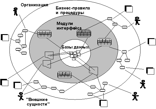 Методология DATARUN базируется на системном подходе к описанию деятельности организации. Построение моделей начинается с описания процессов, из которых затем извлекаются первичные данные (стабильное подмножество данных, которые организация должна использовать для своей деятельности). Первичные данные описывают продукты или услуги организации, выполняемые операции (транзакции) и потребляемые ресурсы. К первичным относятся данные, которые описывают внешние и внутренние сущности, такие как служащие, клиенты или агентства, а также данные, полученные в результате принятия решений, как например, графики работ, цены на продукты. Основной принцип DATARUN заключается в том, что первичные данные, если они должным образом организованы в модель данных, становятся основой для проектирования архитектуры ИС. Архитектура ИС будет более стабильной, если она основана на первичных данных, тесно связанных с основными деловыми операциями, определяющими природу бизнеса, а не на традиционной функциональной модели. Любая ИС (рисунок 3.1) представляет собой набор модулей, исполняемых процессорами и взаимодействующих с базами данных. Базы данных и процессоры могут располагаться централизованно или быть распределенными. События в системе могут инициироваться внешними сущностями, такими как клиенты у банкоматов или временные события (конец месяца или квартала). Все транзакции осуществляются через объекты или модули интерфейса , которые взаимодействуют с одной или более базами данных.