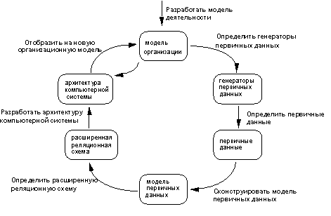 3.1.1. Методология DATARUNОдной из наиболее распространенных в мире электронных методологий является методология DATARUN [6,26]. В соответствии с методологией DATARUN ЖЦ ПО разбивается на стадии, которые связываются с результатами выполнения основных процессов, определяемых стандартом ISO 12207. Каждую стадию кроме ее результатов должен завершать план работ на следующую стадию. Стадия формирования требований и планирования включает в себя действия по определению начальных оценок объема и стоимости проекта. Должны быть сформулированы требования и экономическое обоснование для разработки ИС, функциональные модели (модели бизнес-процессов организации) и исходная концептуальная модель данных, которые дают основу для оценки технической реализуемости проекта. Основными результатами этой стадии должны быть модели деятельности организации (исходные модели процессов и данных организации), требования к системе, включая требования по сопряжению с существующими ИС, исходный бизнес-план. Стадия концептуального проектирования начинается с детального анализа первичных данных и уточнения концептуальной модели данных, после чего проектируется архитектура системы. Архитектура включает в себя разделение концептуальной модели на обозримые подмодели. Оценивается возможность использования существующих ИС и выбирается соответствующий метод их преобразования. После построения проекта уточняется исходный бизнес-план. Выходными компонентами этой стадии являются концептуальная модель данных, модель архитектуры системы и уточненный бизнес-план. На стадии спецификации приложений продолжается процесс создания и детализации проекта. Концептуальная модель данных преобразуется в реляционную модель данных. Определяется структура приложения, необходимые интерфейсы приложения в виде экранов, отчетов и пакетных процессов вместе с логикой их вызова. Модель данных уточняется бизнес-правилами и методами для каждой таблицы. В конце этой стадии принимается окончательное решение о способе реализации приложений. По результатам стадии должен быть построен проект ИС, включающий модели архитектуры ИС, данных, функций, интерфейсов (с внешними системами и с пользователями), требований к разрабатываемым приложениям (модели данных, интерфейсов и функций), требований к доработкам существующих ИС, требований к интеграции приложений, а также сформирован окончательный план создания ИС. На стадии разработки, интеграции и тестирования должна быть создана тестовая база данных, частные и комплексные тесты. Проводится разработка, прототипирование и тестирование баз данных и приложений в соответствии с проектом. Отлаживаются интерфейсы с существующими системами. Описывается конфигурация текущей версии ПО. На основе результатов тестирования проводится оптимизация базы данных и приложений. Приложения интегрируются в систему, проводится тестирование приложений в составе системы и испытания системы. Основными результатами стадии являются готовые приложения, проверенные в составе системы на комплексных тестах, текущее описание конфигурации ПО, скорректированная по результатам испытаний версия системы и эксплуатационная документация на систему. Стадия внедрения включает в себя действия по установке и внедрению баз данных и приложений. Основными результа