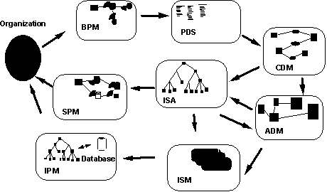 PDS (Primary Data Structure) - структура первичных данных. CDM (Conceptual Data Model) - концептуальная модель данных. SPM (System Process Model) - модель процессов системы. ISA (Information System Architecture) - архитектура информационной системы. ADM (Application Data Model) - модель данных приложения. IPM (Interface Presentation Model) - модель представления интерфейса. ISM (Interface Specification Model) - модель спецификации интерфейса. Рис. 3.3. Модели, создаваемые с помощью подхода DATARUN Создаваемая ИС должна основываться на функциях, выполняемых организацией. Поэтому первая создаваемая модель - это модель бизнес-процессов, построение которой осуществляется в модуле Silverrun BPM. Для этой модели используется специальная нотация BPM. В процессе анализа и спецификации бизнес-функций выявляются основные информационные объекты, которые документируются как структуры данных, связанные с потоками и хранилищами модели. Источниками для создания структур являются используемые в организации документы, должностные инструкции, описания производственных операций. Эти данные вводятся в том виде, как они существуют в деятельности организации. Нормализация и удаление избыточности производится позже при построении концептуальной модели данных в модуле Silverrun ERX. После создания модели бизнес-процессов информация сохраняется в репозитории проекта. В процессе обследования работы организации выявляются и документируются структуры первичных данных. Эти структуры заносятся в репозиторий модуля BPM при описании циркулирующих в организации документов, сообщений, данных. В модели бизнес-процессов первичные структуры данных связаны с потоками и хранилищами информации. На основе структур первичных данных в модуле Silverrun ERX создается концептуальная модель данных (ER-модель). От структур первичных данных концептуальная модель отличается удалением избыточности, стандартизацией наименований понятий и нормализацией. Эти операции в модуле ERX выполняются при помощи встроенной экспертной системы. Цель концептуальной модели данных - описать используемую информацию без деталей возможной реализации в базе данных, но в хорошо структурированном нормализованном виде. На основе модели бизнес-процессов и концептуальной модели данных проектируется архитектура ИС. Определяются входящие в систему приложения, для каждого приложения специфицируются используемые данные и реализуемые функции. Архитектура ИС создается в модуле Silverrun BPM с использованием специальной нотации ISA. Основное содержание этой модели - структурные компоненты системы и навигация между ними. Концептуальная модель данных разбивается на части, соответствующие входящим в состав системы приложениям. Перед разработкой приложений должна быть спроектирована структура корпоративной базы данных. DATARUN предполагает использование базы данных, основанной на реляционной модели. Концептуальная модель данных после нормализации переносится в модуль реляционного моделирования Silverrun RDM с помощью специального моста ERX-RDM. Преобразование модели из формата ERX в формат RDM происходит автоматически без вмешательства пользователя. После преобразования форматов получается модель реляционной базы данных. Эта модель детализируется в модуле Silverrun RDM определением физической реализации (типов данных СУБД, ключей, индексов, триггеров, ограничений ссылочной целостности). Правила обработки данных можно за