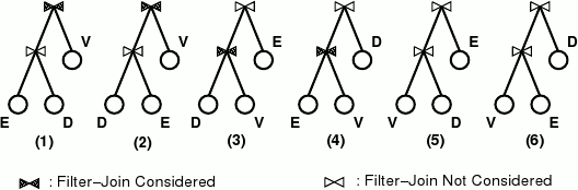 Оценочная оптимизация для магии: алгебра и реализацияПравин Сешарди (Praveen Seshadri, Univ. of Wisconsin, Madison) Перевод: Сергей Кузнецов 3. Магические множества и оптимизация соединенийВ этом разделе мы опишем, каким образом выбор вариантов перезаписи на основе магических множеств можно рассматривать как часть фазы оптимизации соединений оптимизатора запросов. 3.1 Букварь по оптимизации соединенийОптимизатор запросов определяет эффективный порядок, в котором следует производить соединения N отношений, и метод, используемый для каждого соединения. Поскольку операция соединения ассоциативна и коммутативна, имеется обширное пространство из O((2(N-1))!/(N-1)!) возможных порядков соединений [GHK92]. Поскольку это пространство недопустимо обширно для целей анализа даже для небольших значений N, в большинстве практических алгоритмов оптимизации соединений [SAC+79, IK84, KBZ86] анализируются ограниченные области этого пространства. У всех алгоритмов имеется одна общая черта: на каждом шаге в них рассматриваются различные двухместные соединения, и для каждого соединения анализируется стоимость применения различных методов соединения. 3.2 Упорядочение соединений и SIPSРазъясним теперь соответствие между перезаписью на основе магических множеств и упорядочением соединений. Рассмотрим исходный запрос на рис. 1. На рис. 1 графически изображены шесть возможных вариантов порядка соединений Emp E, Dept D и DepAvgSal V; предикаты выборки для краткости опущены.