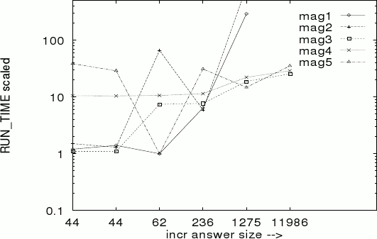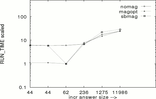 Оценочная оптимизация для магии: алгебра и реализацияПравин Сешарди (Praveen Seshadri, Univ. of Wisconsin, Madison) Перевод: Сергей Кузнецов 6. Измерение производительностиЦели нашего изучения производительности состояли в следующем: (1) Показать, что для магической перезаписи существуют различные варианты выбора SIPS, и что никакой конкретный вариант выбора SIPS не является оптимальным для всех запросов и сред выполнения. (2) Показать, что оценочная магическая оптимизация обеспечивает выбор, близкий к оптимальному, для различных запросов и сред выполнения. (3) Показать, что дополнительные накладные расходы, порождаемые оценочной магической оптимизацией, не влияют на порядок сложности процесса оптимизации. К сожалению, нет «стандартного» тестового набора для оценивания методов, подобных перезаписи на основе магических множеств. Взамен нам пришлось изобретать для этой цели экспериментальную методологию. Выбираемые нами эксперименты должны были быть относительно простыми для понимания и разъяснения. Более того, мы должны были смочь исследовать различные измерения перезаписи на основе магических множеств за небольшое число экспериментов. В следующем разделе описывается наша попытка изобретения такой методологии. 6.1 Экспериментальная методологияТестовый набор TPC-D является общеотраслевым стандартным тестовым набором для сложных запросов [TPCD94]. В тестовом наборе имеются два запроса, к которым может быть применена перезапись на основе магических множеств (Query 2 и Query 17). Нас интересовал Query 2, потому что для него имеется большое число вариантов магической перезаписи (он включает соединение многих отношений), в то время как для другого кандидата (Query 17) имеется только один вариант. В первом эксперименте стартовой точкой является Query 2 из TPC-D. Во внешнем блоке запроса предикаты выборки постепенно изменялись путем их удаления, модификации с целью уменьшения селективности или замены на менее селективные предикаты. Эффект состоял в том, что мощность результата запроса постепенно увеличивалась. Однако реальные таблицы в запросе не изменялись, так что всегда был возможен выбор одних и тех же вариантов SIPS. По мере изменения предикатов разные варианты выбора SIPS становятся оптимальными, и иногда бывает лучше вообще не производить магическую перезапись. Мощность результата запроса грубо связана с возможным эффектом фильтрации вследствие магических множеств; следовательно, мы ожидаем большей пользы от перезаписи на основе магических множеств при меньшей мощности результата. Оптимизатор, усовершенствованный оценочной магической оптимизацией, должен всегда выбирать правильные SIPS для всех запросов. Мы полностью повторили эксперимент после модификации исходного запроса, использованного в качестве стартовой точки (путем изменения содержимого внутреннего блока запроса). Тем самым, мы смогли исследовать воздействия на разнообразные запросы в контролируемой и понятной манере. Мы также повторили эксперимент после ликвидации некоторых индексов, использованных в исходных планах; это представляет изменение в среде выполнения. Следовательно, изменяется стоимость различных частей запроса. Оценочная магическая оптимизация должна быть в состоянии это распознавать и принимать правильное решение в новой среде. Эксперименты производились на рабочей ста