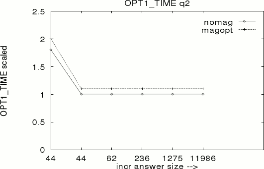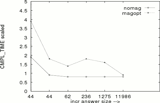 6.5 Результаты времени компиляцииНа диаграмме на рис. 7 показано общее время компиляции (перезапись + оптимизация) при использовании magopt и nomag. Это время включает второй проход оптимизатора, выполняемый при выборе перезаписи на основе магических множеств (заметим, что в данном случае используется линейная, а не логарифмическая шкала). Для более мелких запросов выбирается перезапись на основе магических множеств, и поэтому время компиляции для magopt почти вдвое больше времени для nomag. Эти накладные расходы представляются нам приемлемыми, поскольку для запросов поддержки принятия решений время компиляции обычно мало по сравнению со временем выполнения.