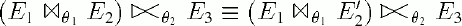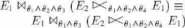 Интуитивно ясно, что в результате выражения E1 ⊳<Θ E2 участвуют только те кортежи E2, которые соединяются с кортежами E1 по предикату Θ. Следовательно выбор подмножества кортежей E2, которые соединяются с E1 по предикату Θ, до выполнения соединения с E1 сохраняет эквивалентность. Заметим, что в результате этого шага вводятся общие подвыражения. Проталкивание Θ-полусоединения через соединение: Ниже мы представляем правило преобразования, описывающее, как протолкнуть Θ-полусоединение через соединения.