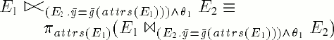 где attrs(E2) функционально определяют все атрибуты в Θ2 над FD(Θ1) Заметим, что использование подмножества функциональных зависимостей при выполнении этого преобразования является безопасным, так что полный механизм вывода функциональных зависимостей не существенен. Устранение Θ-полусоединения: Из интуитивных соображений Θ-полусоединение можно переписать как соединение, за которым следует проекция, если предикат соединения вместе с функциональными зависимостями правого операнда Θ-полусоединения гарантируют, что для каждого кортежа левого операнда выбирается не более одного кортежа левого операнда. Это интуитивное соображение формально фиксируется в следующем правиле преобразования: