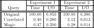Сводка результатов производительности приведена в таб. 2. Для каждого запроса мы приводим общее время и время ввода/вывода. Числовые значения нормализованы с принятием значения 100 для общего времени выполнения исходного запроса. Таким образом, значение общего времени 0.40 для запроса с корреляцией в Эксперименте 1 означает, что для коррелированного запроса потребовалось 40% от времени исполнения исходного запроса, а значение 0.280 для ввода/вывода означает, что система ввода/вывода была занята 28% от общего времени выполнения исходного запроса.
