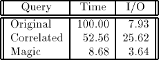 Таб. 3. Относительное полное время и время ввода/вывода для запросов Эксперимента 3 В запросе с корреляцией представление Результаты Эксперимента 3 показывают стабильность преобразования методом магических множеств – даже если он не приводит к оптимальному выбору (по причине неправильной оценки селективности предикатов), полученные результаты не будут намного хуже возможных альтернатив. Поскольку основной целью оптимизации является избежание плохих планов (и вторичной целью является нахождение достаточно хорошего плана), преобразование методом магических множеств часто отвечает целям оптимизации лучше методов корреляции и декорреляции, которые значительно менее стабильны. В связи с чрезвычайно высокой стоимостью процесса оптимизации роль стабильных эвристик становится все более важной ([Pir89]). По этой причине очень ценным фактором является стабильность магических множеств.