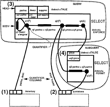Рис. 1. Пример QGM-графа Этот запрос выдает информацию о поставщиках и деталях, для которых цена данного поставщика меньше, чем у всех других поставщиков. На рис. 1 показана QGM для этого запроса. Граф состоит из четырех блоков. Блоки 1 и 2 ассоциированы с базовыми таблицами inventory и quotations. Блок 3 является блоком SELECT, ассоциированным с основной частью запроса, и блок 4 – это блок SELECT, ассоциированный с подзапросом. У каждого блока имеется заголовок и тело. Заголовок описывает результирующую таблицу, производимую блоком, а тело специфицирует операцию, требуемую для вычисления результирующей таблицы. Можно считать, что для базовых таблиц имеются пустые блоки, или что блоки для них не существуют. Исследуем блок 3. В заголовке указаны столбцы результата Тело блока содержит граф. Вершины графа (черные круги в нашей диаграмме) представляют квантифицированные кортежные переменные, называемые квантификаторами. В блоке 3 имеются квантификаторы q1, q2 и q4. Областями определения квантификаторов q1 и q2 являются базовые таблицы inventory и quotations соответственно, и эти квантификаторы соответствуют ссылками на таблицы в разделе FROM SQL-запроса. Заметим, что узлы q1 и q2 связаны межблочными дугами с заголовками inventory и quotations. Дуга между q1 и q2 специфицирует предикат соединения. (Циклическая) дуга, присоединенная к q1, соответствует локальному предикату на q1. В действительности, единственная межквантификаторная дуга представляет конъюнкт раздела WHERE в блоке запроса – конъюнкты представляются в диаграмме помеченным прямоугольником на дуге. Такие дуги также называются булевскими термами [SAC+79]. Квантификатор 3 является квантором всеобщности, ассоциированным с подзапросом ALL в разделе WHERE. Это выражает тот факт, что для всех кортежей, ассоциированных с q4, предикат, который представлен дугой между q2 и q4, является true. В блоке 3 q1 и q2 участвуют в соединениях, и их столбцы используются в кортежах результата. Эти квантификаторы имеют тип F, поскольку они происходят из раздела FROM запроса. У квантификатора q4 тип A, представляющий квантор всебщности (ALL). Предикаты SQL EXISTS, IN, ANY и SOME принимают значение true, если, по крайней мере, один кортеж подзапроса удовлетворяет предикату. Следовательно, все эти предикаты являются экзистенциальными, и у квантификаторов, ассоциированных с такими подзапросами, имеется тип E. Каждый квантификатор помечается столбцами, которые ему требуются из таблицы, являющейся его областью определения. Блок 4 представляет подзапрос. Он содержит F-квантификатор q3 над таблицей quotations, и в нем имеется предикат, ссылающийся на q2 и q3. В теле каждого блока имеется атрибут, называемый distinct, который может иметь значения ENFORCE, PRESERVE или PERMIT. ENFORCE означает, что операция должна удалять дубликаты, чтобы обеспечивать head.distinct = TRUE. PRESERVE означает, что операция может сохранять численность дубликатов, которые она порождает. Так может быть потому, что head.distinct = FALSE, или потому, что head.distinct = TRUE, но никакие дубликаты не могут существовать в результате операции даже без удаления дубликатов. PERMIT означает, что операции разрешается удалять (или генерировать) дубликаты произвольным образом. Например, у атрибута distinct блока 4 может иметься значение PERMIT, потому что этот блок используется в кванторе всеобщности (q4 в блоке 3), а кванторы всеобщности нечувствительны к кортежам-дубликатам. Это рассматрив