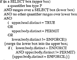 Расширяемая, управляемая правилами оптимизация путем перезаписи запросов в StarburstХамид Пирамеш, Джозеф Хеллерстейн, Вакар Хасан Перевод: Сергей Кузнецов 3. Набор правил перезаписи для гарантирования поглощения SELECTПри разработке наших процессора и правил перезаписи мы стремились придерживаться следующей Философии перезаписи: Везде, где это возможно, запрос следует преобразовывать к одиночной операции SELECT. Простая операция SELECT, действующая над базовыми таблицами, представляет базисный запрос, включающий простые ограничение, проецирование и соединение. Имеются разнообразные высокопроизводительные алгоритмы выполнения таких запросов, и хорошо понятны методы выбора среди этих алгоритмов. Кроме того, как отмечалось выше, наличие более сложных запросов часто навязывает оптимизатору планов выбор конкретного плана – например, наличие подзапросов заставляет применять особые методы и порядки соединений, а использование представлений (как мы увидим) излишне ограничивает возможный порядок соединений в запросе. Наконец, оптимизаторы планов обычно принимают решения на основе среды только одного блока запроса (т.е. одного QGM-блока). В результате запросы с несколькими операциями обычно не приводятся к оптимальным планам, и везде, где это возможно, их следует преобразовывать к одиночным операциям SELECT. Конечно, имеется много оптимизаций, применимых к самим операциям SELECT. Но мы считаем, что преобразование к одиночной операции SELECT во всех возможных случаях находится среди наиболее важных целей преобразования запросов. В результате мы концентрируемся в этой статье на тех правилах перезаписи в Starburst, которые гарантируют, что все представления (табличные выражения) и подзапросы с квантором существования сливаются всегда, когда это возможно. В Starburst к единой операции SELECT не могут быть переписаны только запросы, содержащие подзапросы не с кванторами существования или с не булевскими сомножителями, операции над множествами2, агрегаты и определяемые пользователями расширения (такие как OUTER JOIN). В системе допускается определение правил перезаписи и для таких запросов, так что, хотя они и не преобразуются к одиночной операции SELECT, к ним часто применяются полезные преобразования. Например, Розенталь (Rosenthal) [RGL90] определяет набор таких преобразований для внешнего соединения.