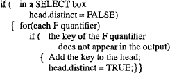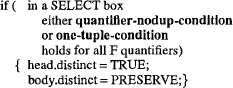 Таб. 3. Пример 1 до и после перезаписи Правило 2. Distinct Pullup (вытягивание Distinct) В правиле DISTPU (таб. 4) для блока SELECT upper делается заключение, что не требуется какое-либо удаление дубликатов для гарантирования уникальности всех его результирующих кортежей. Это делается путем выделения следующих свойств: