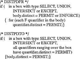 Таб. 4. Правило 2 – DISTPU В upper должны найтись либо условие quantifier-nodup-condition, либо условие one-tuple-condition, которые выдерживаются для всех F-квантификаторов этого блока и ассоциированных с ними предикатов. Если это неверно для некоторого F-квантификатора, то в проекции декартова произведения нижних блоков будут иметься дубликаты, и в upper требуется их удалять; если для каждого F-квантификатора верно хотя бы одно из двух условий, то дубликаты в проекции декартова произведения содержаться не будут. Отметим «локальность» этого правила – при его написании мы не должны заботиться о типе нижних блоков, нас занимают только F-квантификаторы над этими блоками. Правило 3. Distinct Pushdown From/To (проталкивание Distinct из/в) В этой паре правил (таб. 5) блок информирует свои нижележащие блоки о том, что от них не требуется удаление дубликатов. Это делается путем «проталкивания» атрибута distinct из этого блока в его нижележащие блоки. Такое действие может предохранить нижние блоки от потребности сортировки или хэширования для удаления дубликатов, а также может позволить применять к нижним блокам правила, которые могут вводить дубликаты (например, описываемое ниже правило EtoF).