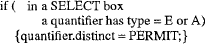 Таб. 5. Правило 3 – DISTPDFR/DISTPDTO Для варианта DISTINCT операций над множествами (UNION, INTERSECT и EXCEPT) правило DISTPDFR является корректным по причине семантики удаления дубликатов в этих операциях. Операции над множествами с DISTINCT определяются как удаляющие дубликаты из всех своих операндов до какой-либо дальнейшей обработки [ISO91]. Так что эти блоки будут игнорировать любые дубликаты, производимые нижележащими блоками, и об этом можно безопасным образом сигнализировать, проталкивая DISTINCT сквозь квантификаторы. В случае блока SELECT с body.distinct = PERMIT нас не беспокоит аспект дубликатов. Чтобы увидить корректность правила DISTPDFR для блока SELECT с body.distinct = ENFORCE, достаточно заметить, что любой кортеж, происходящий из такого блока, является конкатенацией кортежей t1, . . ., tn из n входных источников (под F-квантификаторами) блока. Независимо от того, сколько копий каждого ti имеется в соответствующей входной таблице tablei, в результате блока SELECT DISTINCT будет содержаться, самое большее, один кортеж, спроецированный из t1, . . ., tn. Поэтому в каждом источнике можно безопасно удалять или порождать дубликаты без воздействия на результат такого блока SELECT. Правило DISTPDTO является достаточно простым – если во всех блоках, определенных над данным блоком, указано их безразличие к числу дубликатов, производимых их источниками, то в этом блоке могут каким угодно образом вводиться или удаляться дубликаты, и, следовательно, флаг distinct тела этого блока можно установить в PERMIT, а флаг distinct его заголовка – в FALSE. Отметим использование локальности правила: в этой задаче участвуют два блока, и поэтому она разбивается на два отдельных правила с использованием информации, передаваемой между блоками через квантификатор. При выполнении проталкивания атрибута DISTINCT каждая операция должна заниматься только своим собственным поведением без потребности знать что бы то ни было про другие операции, участвующие в этой активности. Заметим также, что, если обработка останавливается после DISTPDFR, но перед DISTPDTO, граф OGM остается согласованным и допустимым. Правило 4. E or A Distinct Pushdown From Это правило (таб. 6) является частным случаем выталкивания distinct «из»; в правиле используется тот факт, что квантификация кванторами существования или всеобщности слепа к дубликатам. Другими словами, несущественно число кортежей в подзапросе, которые удовлетворяют предикату с квантором существования; для таких предикатов требуется соответствие только одного кортежа подзапроса. Аналогично, число дубликатов в подзапросе не имеет значения для предиката с квантором всеобщности; либо все кортежи в подзапросе удовлетворяют такому предикату, либо он в целом не удовлетворяется.