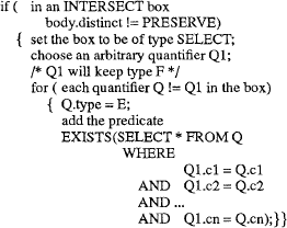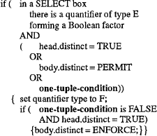 Расширяемая, управляемая правилами оптимизация путем перезаписи запросов в StarburstХамид Пирамеш, Джозеф Хеллерстейн, Вакар Хасан Перевод: Сергей Кузнецов 3.2 Гарантирование слияния подзапросов с квантором существованияПравила предыдущего раздела гарантируют, что блоки SELECT сливаются, когда единственными квантификаторами над нижним блоком являются F-квантификаторы. Следующее правило способствует слиянию путем создания этой ситуации настолько часто, насколько это возможно. В частности, мы увидим, что следующее правило гарантирует слияние конъюнктов подзапросов с квантором существования и вышестоящих блоков SELECT. Правило 7. E to F Quantifier Conversion (преобразование E-квантификатора в F-квантификатор) В этом правиле (таб. 9) мы преобразуем подзапросы с квантором существования булевских сомножителей в табличные выражения путем изменения типа квантификатора над этим подзапросом с E на F. Заметим, что правило ADDKEYS гарантирует, что условие этого правила, в конце концов, будет удовлетворено для всех таких подзапросов. Как отмечалось выше, преобразование подзапроса в табличное выражение (и, следовательно, в ряд соединений) увеличивает число возможных порядков выполнения соединений. Это может также позволить выполнять дополнительные слияния, если подзапрос является еще одним блоком SELECT.