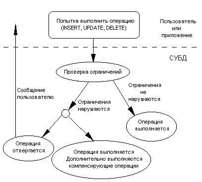 Например, если система знает, что в поле "Возраст_Сотрудника" должны быть целые числа в диапазоне от 18 до 65, то система отвергает попытку ввести значение возраста 66. При этом может генерироваться какое-нибудь сообщение для пользователя. В противоположность этому, в примере 1 система допускает вставку записи о новом сотруднике (что приводит к нарушению целостности базы данных), но автоматически производит компенсирующие действия, изменяя значение поля Dept_Kol в таблице DEPART. Работу системы по проверке ограничений можно изобразить на следующем рисунке: