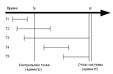 Рисунок 1 Пять вариантов транзакций Последняя контрольная точка принималась в момент tc. Мягкий сбой системы произошел в момент tf. Транзакции T1-T5 характеризуются следующими свойствами: