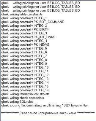 gbak [-B] [ключи] файл_базы_данных файл_резервной_копии Значение ключей: -g не собирать мусор во время резервного копирования; -l игнорировать лимбо-транзакции; -m резервирование только метаданных; -user имя пользователя; -password пароль пользователя; -v показать протоколирование во время выполнения процесса; -z показать версию gbak. Пример: