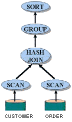 Рис 2. Дерево реализации запроса состоит из итераторов. Каждый итератор производит заданный вид обработки по мере поступления входных данных, не дожидаясь завершения итераторов нижнего уровня.