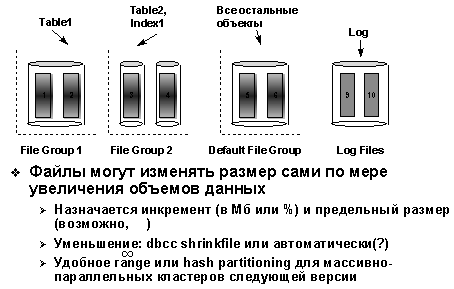 - Файлы могут объединяться в file groups для удобства размещения данных на определенные диски и администрирования