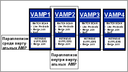 Многомерный параллелизм Равномерное распределение данных на диске обеспечивается при помощи использования хэш-алгоритма. Кроме того, каждому виртуальному процессору AMP передаются не только одинаковые по объему данные, но и одинаковые вычислительные мощности (ЦП и ПАМЯТЬ). Виртуальные процессоры работают параллельно как на узле SMP, так и на многих узлах SMP. Тем самым они образуют основную или горизонтальную составляющую параллелизма и взаимодействуют друг с другом, используя коммуникационный слой передачи сообщений (Message Passing Layer). Кроме того, помимо только что описанного горизонтального параллелизма Inter-Vproc, каждый виртуальный процессор AMP реализует вертикальный параллелизм (Intra-Vproc). В каждом виртуальном процессоре AMP имеется большое число рабочих подпроцессов, находящихся в очереди и ожидающих запуска. По мере увеличение загрузки виртуального процессора AMP, динамически увеличивается и число активных подпроцессов в рамках этого АМР. Когда оптимизатор сгенерировал несколько шагов по выполнению запроса, то их можно параллельно выполнить на нескольких виртуальных процессорах AMP, при этом в рамках каждого АМР-а параллельно запускаются на выполнение несколько подпроцессов. Эти подпроцессы образуют вторичную или вертикальную составляющую параллелизма и взаимодействуют друг с другом через глобальную разделяемую память. Архитектура СУБД Teradata способна эффективно использовать эту двухмерную модель параллелизма как при работе на одном виртуальном процессоре, так и при работе на нескольких виртуальных процессорах. На представленном ниже рисунке дана иллюстрация многомерного параллелизма. Многомерный параллелизм