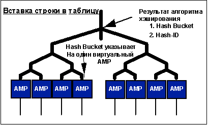 Распределение данных Равномерное распределение данных - это ключевое понятие при реализации распределенной, параллельной загрузки системы. Для реализации равномерного распределения данных СУБД Teradata использует одну схему распределения, основанную на использовании хэш-алгоритма. Данные обрабатываются с помощью достаточно сложного алгоритма хэширования и автоматически распределяются между всеми виртуальными процессорами AMP, в соответствии с результатами этого хэширования. Данный алгоритм зарекомендовал себя как чрезвычайно эффективный для равномерного распределения данных. Он используется с 1983 года, и в течении всего последующего периода корпорация Teradata постоянно совершенствовала его для устранения неравномерного распределения данных, даже когда размер данных БД превышал 100 Тбайт. На показанном далее рисунке иллюстрируется схема фрагментации данных. Хэш-фрагментация