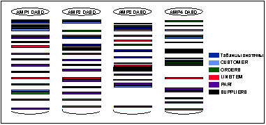 При вставке строки в таблицу выполняется обработка значений в колонках, по которым объявлен первичный индекс. Это значение прогоняется через алгоритм хэширования. При этом вычисляются значения Hash Backet и Hash ID (хэш-идентификатор). СУБД Teradata всего имеет 65 535 значений Hash Bucket, которые распределяются случайным образом между всем виртуальными процессорами АМР. Если колонки, образующие первичный индекс вставляемой строки, были выбраны нужным образом (для обеспечения равномерности данные в этих колонках должны быть уникальны или почти уникальны), то погрешность равномерности распределения данных составляет порядка 0.5%. Именно значение Hash Bucket, вычисленное алгоритмом хэширования, и определяет, какому виртуальному процессору AMP принадлежит нужная строка. Дело в том, что строка будет храниться на дисках, принадлежащих виртуальному данному виртуальному процессору AMP. Еще раз подчеркнем: в СУБД Teradata для размещения данных используется только схема хэширования. Данная методология размещения данных имеет важное значение для обеспечения равномерной загрузки системы, что необходимо для поддержки высокоскоростной параллельной обработки данных. Поэтому СУБД Teradata не предоставляет никаких других способов размещения данных, чтобы поддерживать равномерность загрузки внутри всей системы в целом. Кроме того, в СУБД Teradata не выделяется заранее файловое пространство, а администратор БД заранее не рассчитывает, сколько места займет каждая таблица и на каком диске она должна находится. Таким образом, размещение данных полностью автоматизировано. На следующем рисунке объекты представляют все данные, которые размещаются на одном виртуальном процессоре AMP. Распределение данных СУБД Teradata