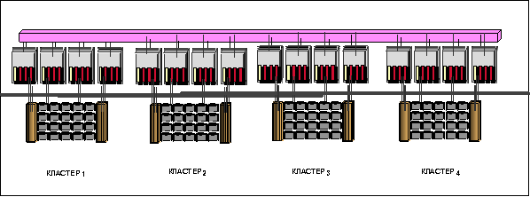 Реализация СУБД Teradata в архитектуре MPP (5100 и 5150) На следующем рисунке показано использование СУБД Teradata в системе MPP, состоящей из четырех кластеров, каждый из которых состоит из четырех узлов SMP, соединенных между собой шиной BYNET. Как и в случае с однокластерной системой, на каждом узле работают несколько виртуальных процессоров AMP и несколько виртуальных процессоров PE. При этом можно либо распределить равномерно процессы по узлам, либо приписать каждому AMP или PE определенный узел. Слой передачи сообщений реализован в виде комбинации программного обеспечения PDE и BYNET. Кластеры не разделяют ни программное, ни аппаратное обеспечение. Архитектура СУБД share nothing естественно гармонирует с архитектурой системы, а возможности масштабируемости практически беспредельны. Teradata MPP