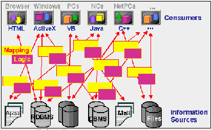 Современное предприятие Появление мультимедиа в этой и без того запутанной ситуации заставляет особенно остро ощутить потребность в кардинально новом решении. Мультимедиа - это сложный тип информации. Для разработки мультимедийных приложений обычно используются объектно-ориентированные языки. Однако очень часто можно наблюдать "несогласованность сопротивлений", когда приложение, написанное на объектно-ориентированном языке, пытаются привязать к необъектным базам. Приложение, обученное работе с объектами, просто задыхается от необходимости непрерывно собирать в объекты множество разрозненных данных, хранящихся в традиционных базах. Мультимедийные данные должны интерпретироваться перед обработкой. Возьмем простой пример: растровое изображение должно быть распознано как таковое, прежде чем над ним будут выполняться различные графические операции или вывод на экран. Традиционная база данных способна лишь хранить файл изображения, а всю работу по его распознаванию и обработке вынуждено делать приложение. Еще одна сложность заключается в том, что все приложения, обращающиеся в базу за мультимедийными данными, должны выполнять все операции выборки, распознавания и обработки этих данных единообразно. Это приводит к значительному увеличению накладных расходов, если необходимо дублировать код для различных платформ, используемых на предприятии. Обновление приложений становится тем сложнее, чем чаще изменяются данные - особенно при смене формата. По мере роста самого предприятия увеличивается и объем хранимой информации, что часто вызывает серьезные проблемы при ее хранении, сортировке, отслеживании и индексировании и т. п. К тому же необходимо отдавать себе отчет в том, что любые данные не находятся в вакууме. Мультимедийную информацию часто приходится комбинировать с традиционной, хранящейся в реляционных и нереляционных базах. Простой метод хранения и обработки мультимедиа в сочетании с традиционными типами данных предприятия - главное требование к разработчикам приложений нового поколения. Решение: объектная технология Объектная технология позволяет комбинировать мультимедийные данные с другими типами информации, включая бизнес-логистику, и создавать так называемые "бизнес-объекты". Эти объекты представляют собой наборы связанных данных, включающие также программные коды, так называемые "методы", и используемые для формирования "пакетов", имеющих отношение к определенному звену предприятия, например, сотруднику. Объект типа "сотрудник" может содержать как традиционную текстовую информацию (имя, адрес и т.п.), так и мультимедийные данные (фотографию, видеоклип или отпечатки пальцев), вместе с методами, такими как прием на работу, перемещение, повышение должности и т. п. Методы создаются и хранятся вместе с данными внутри бизнес-объекта и представляют собой набор правил, определяющих то, как объект может взаимодействовать с пользователями, приложениями или другими объектами. В методе может быть заложена не только простейшая операция, как например, вывод изображения на экран, но и сложные процедурные алгоритмы. Поскольку интерфейсы методов определены заранее, разработчику не нужно беспокоиться о манипуляциях с мультимедийными данными - об этом позаботится сама база. Сочетание бизнес-логистики и данн