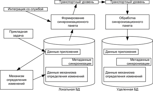 Рисунок 2 Структура DBSync При установке DBSync в базе данных создается набор таблиц с метаданными синхронизации. В метаданных хранятся списки узлов синхронизации (удаленных баз данных), списки таблиц, которые необходимо синхронизировать, правила синхронизации и т.д. Кроме того, для прикладных таблиц, которые включены в процесс синхронизации данных, создаются вспомогательные таблицы. Вспомогательные таблицы используются механизмом определения изменений для хранения служебной информации. Механизм определения изменений базируется на триггерах. Когда прикладная задача модифицирует данные, информация об этом событии заносится во вспомогательные таблицы. При этом объем служебной информации ограничен и не увеличивается при многократных изменениях одной и той же записи. Синхронизация локальной базы с удаленным узлом возможна в режимах on-line и off-line. В режиме on-line клиент синхронизации устанавливает соединение с сервером синхронизации по одному из поддерживаемых on-line протоколов (TCP/IP, HTTP и т.д.). Затем формируется пакет синхронизации, передается на удаленный сервер БД и там обрабатывается. В зависимости от обстоятельств пакет синхронизации может содержать либо все данные (начальная синхронизация, восстановление после сбоев), либо данные, которые были модифицированы с момента последнего сеанса синхронизации с данным узлом. Модуль интеграции со службой каталогов определяет, какие именно таблицы и по каким условиям будут выгружены в удаленную базу. После успешной обработки пакета удаленной стороной в локальную базу возвращаются изменения, которые произошли в удаленной базе. На этом сеанс синхронизации завершается. В случае off-line протокола алгоритм обмена пакетами зависит от настроек DBSync. DBSync обеспечивает возможности обмена данными между синхронизируемыми базами данных при помощи следующих сетевых протоколов: TCP/IP – наиболее быстрое и надежное решение. Обеспечивает дуплексную сессию синхронизации. При необходимости шифрации сообщений имеется возможность работать через SSL. HTTP – аналогично TCP/IP обеспечивает получение подтверждений о приходе пакетов от базы-приемника, и сохранения пакетов не требуется. Серверная часть (принимающая соединения) реализована в варианте собственного сервера, понимающего подмножество http. Главным преимуществом при использовании этого протокола является возможность работы через Internet. E-MAIL – Данный вариант обмена не гарантирует надежной доставки данных, но позволяет использовать любые возможности для отправки данных, т.к. e-mail является очень распространенным сервисом. FILE – Имеет такие же ограничения, как и E-MAIL. Пакет синхронизации данных оформляется в виде файла. Доставка файла может осуществляться по ftp, с помощью гибких носителей и т.п.