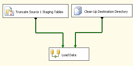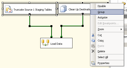 Рисунок 20 Сначала нужно выбрать задачу по имени Truncate Source 1 Staging Tables, затем другую задачу. Это можно сделать, либо удерживая нажатой клавишу Crtl и поочередно нажимая кнопку мыши на каждой задаче, либо выделив мышкой всю область, включающую обе задачи. Теперь можно нажать правую кнопку мыши для доступа к контекстному меню и выбрать в нем пункт Group, как показано на Рисунке 21.