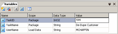 Рисунок 24 ПеременныеОдно из вспомогательных в режиме редактирования окон отображает список переменных. Переменные используются в пакете для передачи значений между задачами и для динамического управления ходом выполнения пакета. Окно Variables (см. Рисунок 25) отображает имя, область видимости, тип данных и значение переменной.