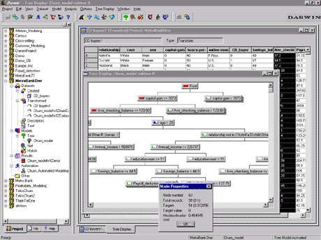 В этом случае мы используем алгоритм "дерево решений" для ответа на вопрос: "Кто, возможно, купит автомашину Buick?" При каждом расщеплении дерева клиенты делятся на две группы. В данном примере первое расщепление происходит на основе возраста и второе - на основе пола. Отметим, что по мере того как data mining "вкапывается" все глубже и глубже в данные, он создает все больше "отфильтрованных" (refined) сегментов однородных групп клиентов с похожим поведением. Каждый конечный узел предоставляет "правило" ("rule"), которое описывает группу клиентов. Чем глубже вы спускаетесь по дереву, добавляя характеристики "правилу", тем выше уровень "уверенности" ("confidence") в точности предсказания. Например, правило нижнего левого узла дерева таково "Родители владеют автомобилем Buick, Мужчина, возраст более 45 лет" ("Parents owned Buick, Male, and Age is over 45") с уровнем уверенности 92%, что клиент с этим профилем купит Buick. Обладая такой информацией, компании могут взаимодействовать с клиентами индивидуализировано. Oracle Data Mining Suite (DARWIN RELEASE 3.7)Комплект Oracle Data Mining Suite Release 3.7 - это программный продукт data mining, выполняющийся на UNIX-сервере, который предоставляет легкость использования и богатую функциональность для решения сложных проблем. Oracle Data Mining Suite находит скрытые закономерности в данных, строит модели предвидения (predictive models) и помещает свои "предвидения" ("predictions") и "интуиции" ("insights") в базу данных для использования другими приложениями и пользователями Oracle. Иначе говоря, Oracle Data Mining Suite - это "производитель" ("producer") ценной новой информации для других "потребителей" ("consumers") данной организации. Oracle Data Mining Suite предоставляет легкий в использовании, интуитивно понятный пользовательский интерфейс. Oracle Data Mining Suite предлагает мастер-утилиты (wizards) для упрощения и автоматизации шагов data mining. Например, мастер Key Fields в Oracle Data Mining Suite автоматически находит переменные, которые наиболее нужны (максимально влияют) при решении некоторого конкретного вопроса. Мастер Model Seeker автоматически строит многие модели data mining, показывает интерактивные графы (interactive graphs) и таблицы результатов, а также рекомендует наилучшие модели. Oracle Data Mining Suite предлагает всю эту функциональность в дружественной пользователю среде, которую бизнес-аналитики могут использовать, причем они могут использовать мощные, возможно, многопроцессорные (SMP) системы и, благодаря этому, смогут "раскапывать" огромные массивы данных и извлекать больше ценной информации. Oracle Data Mining Suite может получать данные из различных сетевых источников данных. Oracle Data Mining Suite извлекает информацию из баз данных Oracle, используя технологию прямого доступа к данным Oracle (OCI). Корпорация Oracle также предоставляет шлюзы (gateways) к данным, хранимым в других базах данных. Как только вы обеспечите Oracle Data Mining Suite данными, вам часто будет нужно подготовить эти данные для анализа, и Oracle Data Mining Suite предоставляет обширный набор функций преобразования, таких как отбор образцов (sampling), случайный выбор (randomization), генерация новых вычисляемых полей, обработка (handling) отсутствующих значений, слияние (merging), замена значений, расщепление набора данных в последовательность (train) поднаборов, тестирование и наборы данных для сверки (evaluation datasets) и так далее. На фазе построения моделей Oracle Data Mining Suite предоставляет множество алгоритмов -C&RT, деревья классификации и регрессии (classification and regression trees), также известных 