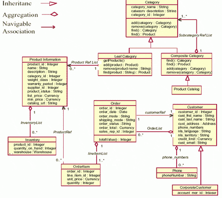 Спецификации UML – это сплав лучших результатов, достигнутых в индустрии объектно- ориентированных технологий. Текущей является версия 1.4 этих спецификаций от Object Management Group (OMG), международной организации, разрабатывающей стандарты объектных технологий. (Прим. ред. В июне 2003 г. консорциум OMG принял новую версию этого стандарта – UML 2.0.) UML определяет стандартные конструкции для описания объектно-ориентированного программного обеспечения как объектной модели. Например, UML-диаграмма на рис. 1 изображает объектную модель приложения "Оперативный каталог", которое корпорация Oracle разработала как часть нового проекта Common Schema (общая схема). В этой объектной модели есть несколько классов (например, Category, leafCategory). Каждый из этих классов обладает рядом атрибутов и операций. Например, класс Category обладает атрибутами category_name и category_description, а также операциями add() и remove(). Классы также связаны между собой различными связями. Например: