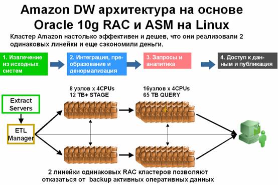 Развитие СУБД Oracle как платформы для GRID вычисленийНачиная с версии 10g компания Oracle позиционирует свою СУБД как платформу для GRID вычислений. Концепция GRID вычислений достаточно проста, понятна, гибка и позволяет экономить средства предприятия [1]. Поэтому в последнее время наблюдается постепенное внедрение этой архитектуры в IT инфраструктуру.Вскоре ожидается появление первых GRID с более чем тысячью процессоров. Сегодня многие крупные информационные системы используют от 100 до 300 процессоров. Реализуются как малые кластеры, состоящие из нескольких больших SMP машин (например, 2 узла по 64 процессора или 4 узла по 32 процессора), так и большие кластеры, состоящие из множества мелких элементов (например, 32 узла по 4 процессора). Для российских заказчиков тестируются конфигурации с 1,5 сотней процессоров. Кроме того, все большую популярность приобретают многоядерные процессоры. Сейчас большинство новых серверов имеет двух – четырех ядерные процессоры и это не предел. Поэтому эра систем с тысячами процессоров уже не за горами. Нужна платформа, позволяющая эффективно реализовывать приложения на этой инфраструктуре. Oracle предлагает в качестве такой платформы GRID на основе СУБД Oracle 11g. Уже сегодня Oracle 10g позволяет объединить в кластер до 64 узлов. В Oracle 11g эта цифра удвоится. И каждый узел может иметь множество процессоров и ядер. Таким образом суммарная вычислительная мощность такой GRID может превысить вычислительную мощность серьезных mainframe машин. Кстати, уже сегодня Oracle использует для TPC тестов двухтеррабайтный буферный кэш, так что растет не только процессорная мощность GRID, но и ее суммарная память. Одним из примеров удачного внедрения GRID технологии является хорошо известный многим Интернет магазин Amazon.com. Изначально хранилище данных Amazon.com было реализовано на основе нескольких SMP машин, но затем, с целью повышения мощности и снижения стоимости системы, ее решили перевести на платформу GRID. В качестве элементов GRID использовались четырехпроцессорные компьютеры с OC Linux, на которых был установлен Oracle 10g RAC и Oracle ASM. Архитектура системы представлена на рисунке 1.