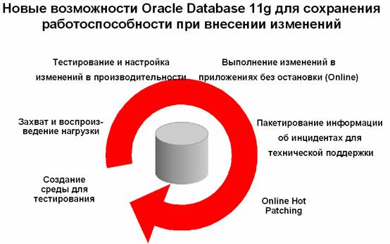 Извлечением данных занимаются так называемые extract серверы. Далее они передают данные в блок интеграции и преобразований. SMP машины блока интеграции и преобразований были заменены GRID из 8 узлов. Объем данных, хранимых на этом этапе – 12 терабайт. SMP машины блока обработки запросов и анализа были заменены на GRID из 16 узлов. Объем данных хранилища – 66 терабайт. Данные extract серверов поступают в первый GRID (это Stage область), после чего загружаются в хранилище на второй DRID. После реализации такой линейки из 8+16=24 узлов выяснилось, что стоимость такой инфраструктуры, благодаря использованию дешевых элементов, более чем в 2 раза ниже стоимости предыдущей системы. Поэтому было принято решение реализовать вторую такую же линейку из 8+16 узлов, которая будет дублировать работу первой линейки. Теперь данные extract серверов поступают как на первую, так и на вторую линейку серверов и в компании всегда существует 2 одинаковые версии хранилища. Одна из них является основной, а на вторую можно переключиться в случае сбоя. Такая архитектура позволила отказаться от частого копирования активных оперативных данных. Причем суммарная стоимость такой продублированной архитектуры оказалась ниже стоимости старой системы. Этот пример еще раз подчеркивает преимущества GRID вычислений, поэтому в версии Oracle 11g был реализован ряд изменений, улучшающих использование СУБД Oracle в GRID. Особое внимание было обращено на снижение времени простоя элементов GRID. Если раньше большинство производителей СУБД прилагало усилия к снижению времени простоя систем, возникающего из-за внезапных, незапланированных причин (поломка компьютера, сбой операционной системы или приложения, человеческие ошибки, катастрофы, потери файлов и т д.), то теперь Oracle сосредоточился на снижении времени плановых простоев. Плановые остановки систем бывают связаны с патчированием или апгрейдом оборудования, операционных систем, СУБД, а также с исправлением или апгрейдом пользовательских приложений СУБД. Кроме того, операции по тестированию и настройке СУБД и приложений требуют либо остановки/замедления работы эксплуатационной системы, либо создания дополнительных копий БД на дополнительных компьютерах. Список новых возможностей Oracle 11g для сохранения работоспособности приложений при внесении изменений изображен на рисунке 2.