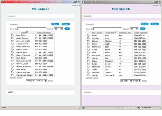 Рис. 2. Новые возможности Oracle 11g для сохранения работоспособности приложений Коротко рассмотрим эти возможности. 1. Создание среды для тестированияВ Oracle 10g реализованы 2 варианта создания резервной базы – логический и физический standby. Физический standby работает быстро, но при использовании standby базы для операций чтения ее восстановление приостанавливается. Логический standby имеет ряд ограничений на типы данных, используемые в БД (например, нельзя использовать LOBs).Поэтому в Oracle 11g реализовано 2 новых типа standby базы: Phisical Standby with Real-Time Query и Snapshot Standby. Phisical Standby with Real-Time Query похож на старый Физический standby, однако в то время, когда standby база открыта на чтение, она продолжает догонять основную БД (восстанавливается на физическом уровне). Т е одна и та же база может использоваться как для защиты от катастрофических сбоев, так и для разгрузки основной базы и для тестирования read only приложений. Так на ней можно печатать отчеты, выполнять бэкапы, заниматься аналитикой и Data Mining. Snapshot Standby позволяет использовать резервную базу для тестирования новых приложений и настройки старых приложений. В то время, как snapshot standby база догоняет основную базу, на ней можно тестировать приложения, которые читают и меняют данные в БД. После возврата из режима Snapshot Standby в режим Phisical Standby, все изменения, сделанные тестируемым приложением, будут аннулированы. 2. Захват и воспроизведение нагрузкиДля того, чтобы разобраться в том, что происходит с эксплуатационной базой во время ее работы, бывает полезно в более позднее время на тестовой базе воспроизвести точный сценарий работы эксплуатационной базы за определенный период времени. Это позволит не спеша разобраться с проблемами, настроить работу СУБД, оптимизировать работу критичных SQL операторов и т. д. Функция Database Replay позволяет записать (как на видеомагнитофон) информации обо всем, что происходит с эксплуатационной СУБД, сохраняя информацию об одновременности выполнения операций. Далее эта “запись” проигрывается в реальном времени на тестовой БД или на Snapshot Standby БД, где ДБА может исследовать работу СУБД. Другой режим – SQL Replay – позволяет захватить и записать всю информацию, связанную с отдельными SQL операторами. Захватывается не только текст этих SQL операторов, но и статистика выполнения, планы выполнения и т д. При воспроизведении записи на тестовой БД можно анализировать работу SQL, оптимизировать их работу, сравнивать статистику работы при различных значениях настроек и т д. Например, воспроизведение записанных SQL операторов на тестовой БД с новой версией СУБД Oracle, позволит выявить SQL операции, производительность которых снизилась, и вызвать программу Tuning Advisor для их оптимизации с учетом возможностей новой версии СУБД. Для этого в Oracle Enterprise Manager (OEM) реализованы дополнительные экраны, где видны результаты сравнения производительности SQL. 3. Выполнение изменений в приложениях без их остановкиБольшие важные приложения часто бывают недоступны в течение десятков часов из-за установки новых версий этих приложений. Oracle 11g вводит новое революционное решение, позволяющее выполнять смену версии приложения не останавливая работу этого приложения. Старая и новая версии приложения могут работать одновременно. На рисунке 3 приведен пример двух версий приложения. В старой версии было всего 2 колонки: имя и телефон. В новой верси