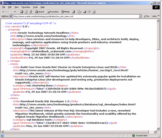 Кроме того, некоторых целей, преследуемых далее, можно достичь иными путями. Так, первое, что приходит в голову - программирование, которого дальше, однако, я сознательно избегаю. Для удобства занесем адрес канала в переменную SQL*Plus: VARIABLE url VARCHAR2 ( 1000 ) EXECUTE :url := 'http://www.oracle.com/technology/syndication/rss_otn_news.xml' Если обращение в интернет будет осуществляться через приближенный (proxy) сервер, требуется предварительно выдать что-то вроде: